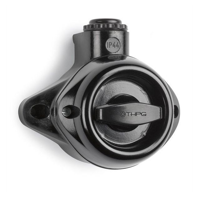 Mustasta bakeliitista valmistettu pinta-asennettava pyöreä katkaisin. Tämänkaltaista katkaisijaa on käytetty ennen vanhaan tavallisesti mm. kellareissa ja ulkorakennuksissa.