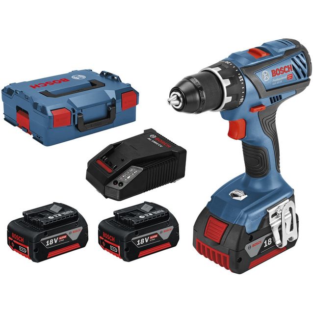 Toimitus sisältää kaksi 4,0 Ah:n akkua ja laturin. Akut ovat yhteensopivia kaikissa 18 voltin Bosch Professional -akkukoneissa. Kone toimitetaan kätevässä L-Boxxissa. Porakoneen paino akkuineen on 1,8 kg.