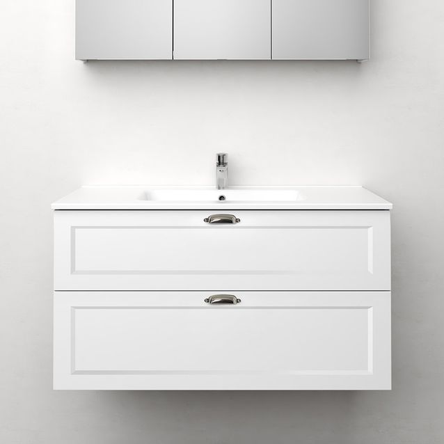 Kahdessa värissä saatavilla ole kylpyhuoneen allaskaappi Westerbergs Nejd on 1000 mm leveä, mattapintainen allaskaluste, joka sopii klassiseen makuun. Kaapissa on pehmeästi sulkeutuvat ja täysin avautuvat laatikot, metalliset laatikon sivut ja irrotettava tamminen laatikon sisäosa. Laatikoiden pohjassa oleva irrotettava matto pitää tavarat paikoillaan ja ylälaatikon U-rakenne jättää tila vesilukolle. Kaluste sopii sekä lattia- että seinäkaivolla ja siinä on säädettävät ripustushelat. Toimitus ei sisällä pesuallasta, pohjaventtiiliä, vetimiä tai hanaa.