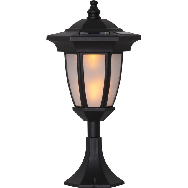 Aurinkokennolla toimiva LED-ulkolyhty mustaa muovia. Lyhtyä voi käyttää seinä-, lattia- tai pöytälyhtynä tai asettaa maapiikin kanssa maahan. Lyhdyn liekehtivä lamppu syttyy illalla, kun hämärtyy ja palaakerrallaan n. 5 tuntia.