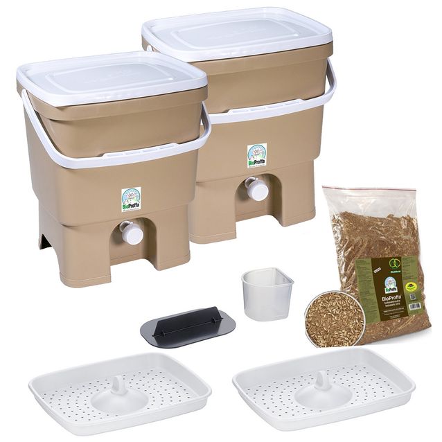 Beige BioProffa Bokashi Organko keittiökompostori valkoisella kannella. Bokashi-keittiökompostointi on helppo tapa kierrättää biojätteet vastuullisella tavalla ja sen avulla saadaan talteen tärkeät ravintoaineet. Elävien mikro-organismien (EM) avulla tavallisista keittiöjätteistä, kuten vihanneksista ja kasviksista, saat nopeasti ravintorikasta multaa puutarhaan tai hyötykasviviljelyyn - lähes ilman hiilijalanjälkeä. Tuloksena saadaan ravinnerikasta multaa, joka on täynnä mikrobeja. Pakkaus sisältää kaksi 16 litraista kompostoria sekä molempiin kannen, hanan ja siivilän. Mukana tulee myös 600g bokashirouhetta, rouheen annostelukauha, tiivistyslasta, nesteen valutuskuppi sekä käyttöohjeet.