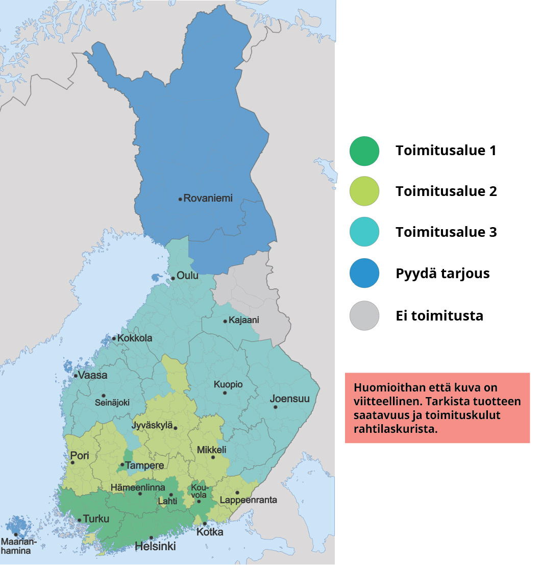 Tuotekortin kartasta näet toimituksen saatavuuden alueellesi. Kartta on suuntaa-antava ja postinumerolla tapahtuva rahtilaskenta kertoo täsmällisen hinnan tuotteen toimitukselle, sekä saatavuuden haluttuun toimitusosoitteeseen.