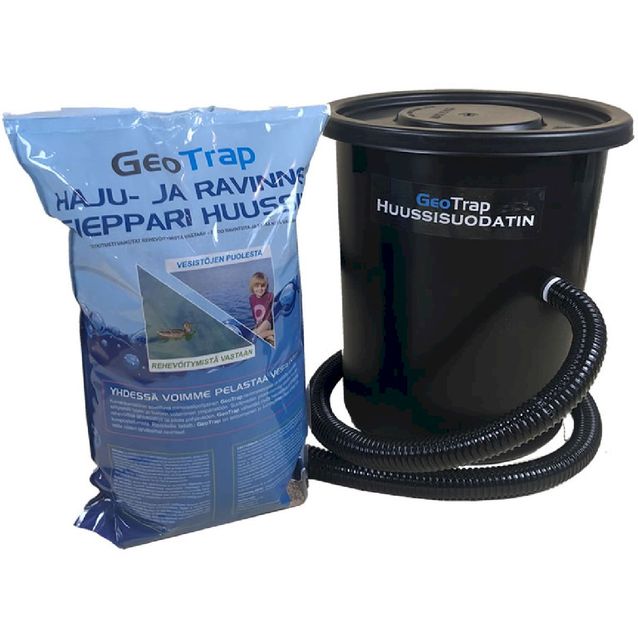 GeoTrap Huussisuodatin on tarkoitettu kuivakäymälöiden suotenesteiden puhdistukseen. Huussisuodattimen toiminta perustuu GeoTrap Haju- ja ravinnesiepparimassaan, joka kerää itseensä ympäristölle haitalliset ravinteet suotonesteestä ja päästää puhtaat ainesosat takaisin luontoon. GeoTrap Huussisuodatin on erinomainen lisävaruste kaikkiin kompostoiviin kuivakäymälöihin. Se helpottaa kuivakäymälän huoltoa erityisesti kohteissa missä on paljon käyttöä ja sitä kautta runsas nestekuormitus. Mökkikäytössä Geotrap massa vaihdetaan kerran kaudessa, julkisissa kohteissa 1-3 krt kaudessa käytöstä riippuen. GeoTrap Huussisuodattimeen ei saa johtaa vesivessan vettä.