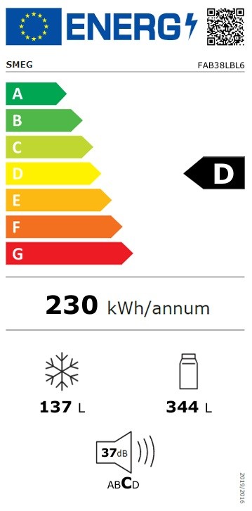 Smeg varustettu invertterikompressorilla ja R600a-kylmäaineella, mikä tekee siitä hiljaisen ja energiatehokkaan. Äänitaso vain 37 dB(A), joten laite häiritsee vain vähän avokeittiössä. Energialuokka D uuden energiamerkinnän mukaan, ja melupäästöt luokitellaan luokkaan C. Laite rakennettu moderneilla komponenteilla, mikä takaa korkean käyttövarmuuden. Liitäntäjohto 1,8 m pitkä, ja se varustettu europistokkeella. Teho 127 W, ja laite toimii ilmastoluokassa Sn-t, mikä tarkoittaa, että se toimii optimaalisesti vaihtelevissa huonelämpötiloissa 10 °C ja 43 °C:n välillä.