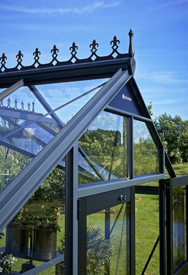 Kauniissa ja tilavassa Orangeri kasvihuoneessa on pariovet, joissa on kätevät tuuletusaukot. Kattoluukkujen avulla teet ilmastoinnista entistäkin tehokkaampaa ja säätelet sitä nopeasti haluamallasi tavalla. Perustuksen voit toteuttaa sokkelilla tai ilman, tiivisteenä toimii silikoni tai tiivistenauha.