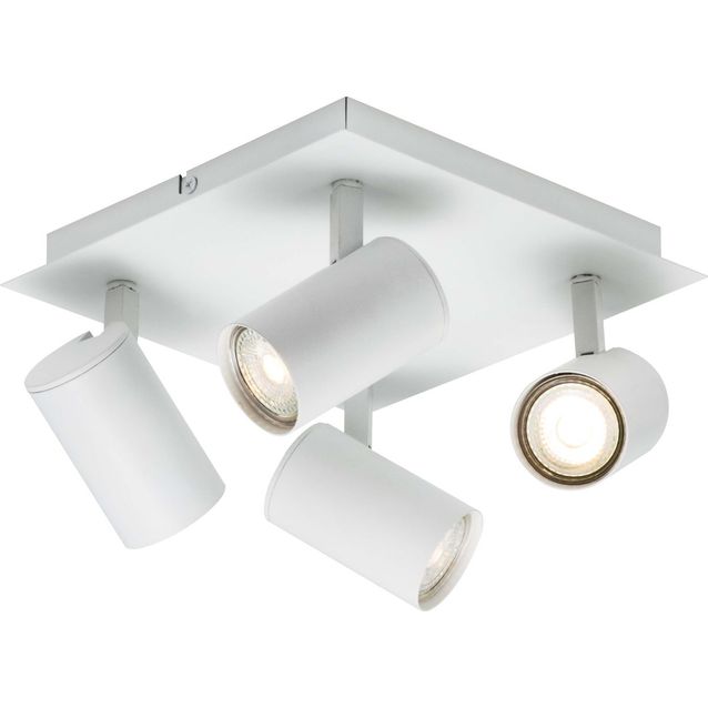 Selkeälinjainen kohdevalaisin neljällä spotilla. Valaisimen materiaali on mattavalkoista metallia ja se sopii vaikkapa eteisen valaisimeksi. Valaisimen leveys ja syvyys ovat 23 cm ja korkeus 11,5 cm. Spottien halkaisija on 5,1 cm ja ne ovat suunnattavia (90°). Kattoa vasten tulevan kapeamman osan koko on 20 x 20 cm.