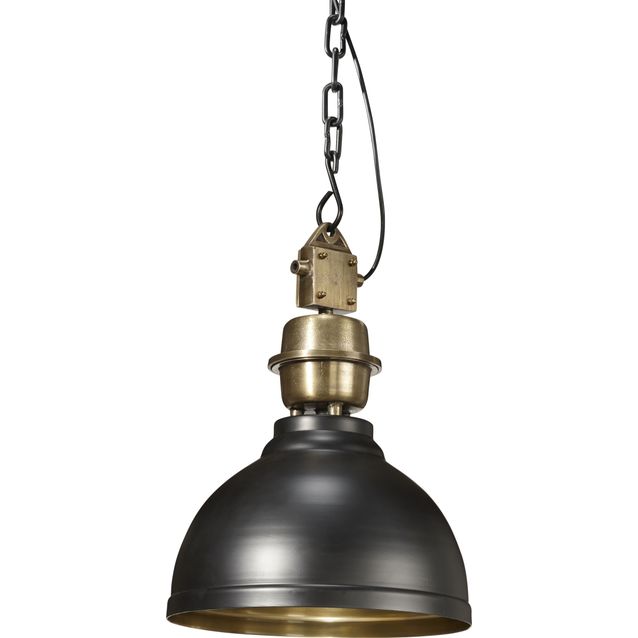 Metallinen industrial-tyylinen kattovalaisin. Valaisimen halkaisija on 35 cm ja korkeus 50 cm. 1,2 metriä korkea ripustusketju ja kattokuppi, värinä raakamessinki. Ei sisällä valonlähdettä. E27-kanta, max. 40W. Maadoitettu.
