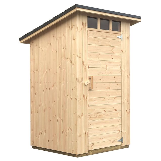 Elementeistä koottava piharakennus on tuossa tuokiossa käyttövalmis ja pintakäsittelyllä voi vaikuttaa rakennuksen ulkonäköön. Pohja-alaltaan 118x123 cm kokoinen puucee toimitetaan puuvalmiina. Kun valitset tilaukseen mukaan T451-korotuspalan, jossa on kaksi porrasaskelmaa, pystyt sijoittamaan rakennukseen vaikka kompostikäymälän.