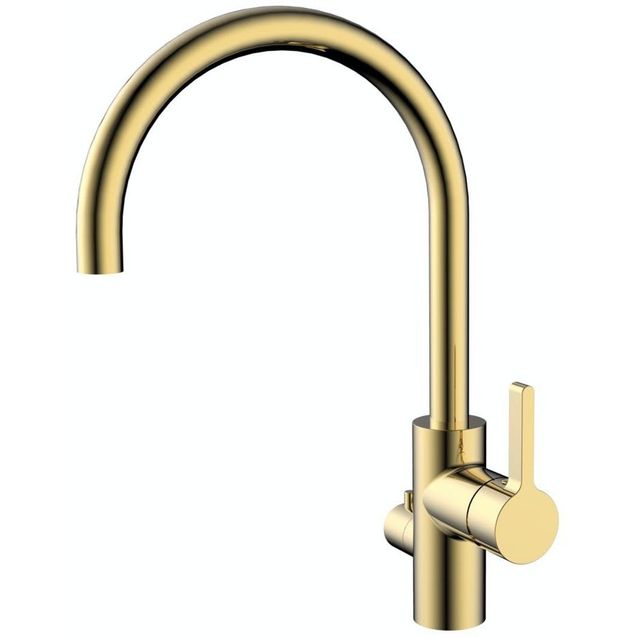 Pesukoneventtiilillä varustettu korkea keittiöhana Bathlife Ocean on ylellinen, kullan värinen hana, jossa on kääntyvä, C-mallinen juoksuputki. Tyylikäs hana sopii erinomaisesti moderniin keittiöön, jossa hanan kultainen pinta on elegantti yksityiskohta. Hanan pinta on helppo pitää puhtaana vedellä ja saippualla, ja asennusta helpottavat joustavat asennusputket.