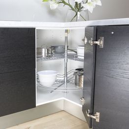 Keittiön kulmakaappi hyödyntää tehokkaasti keittiön nurkkatilan ja tarjoaa kätevän säilytysratkaisun astioille, kattiloille ja tarvikkeille. Valitse tarpeisiisi sopiva mekanismi tai runkomalli ja luo toimiva kokonaisuus keittiöösi!