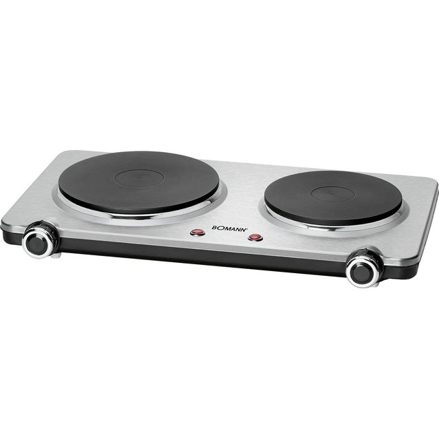 Kaksiosainen Bomann DKP5033ECB-keittolevy portaattomalla tehosäädöllä. Settiin kuuluu kaksi kantokahvaa.