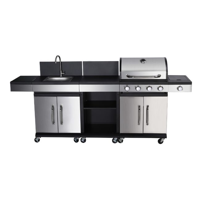 Tee kesäkeittiöstäsi täydellinen Dose Barbeque Pihakeittiö 4+1 -polttimen kaasugrillillä, työtasolla ja pesualtaalla. Tämä monipuolinen kokonaisuus koostuu kolmesta moduulista: tehokkaasta kaasugrillistä, käytännöllisestä työskentelytasosta ja kätevästä pesualtaasta, jotka yhdessä muodostavat toimivan ja tyylikkään ulkokeittiöratkaisun.