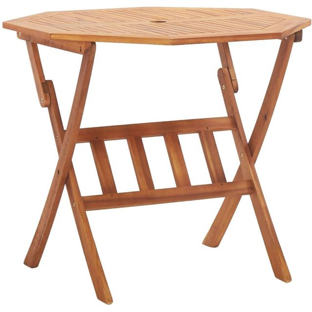 Ulkotilan ruokapöytä on valmistettu täydestä akaasiapuusta, trooppisesta kovapuusta, joka on säänkestävä ja erittäin kestävä. Siinä on reikä keskellä päivänvarjoa varten. Pöytä voidaan taittaa kokoon tilan säästämiseksi, kun sitä ei käytetä. Ruokapöytä on koottava.