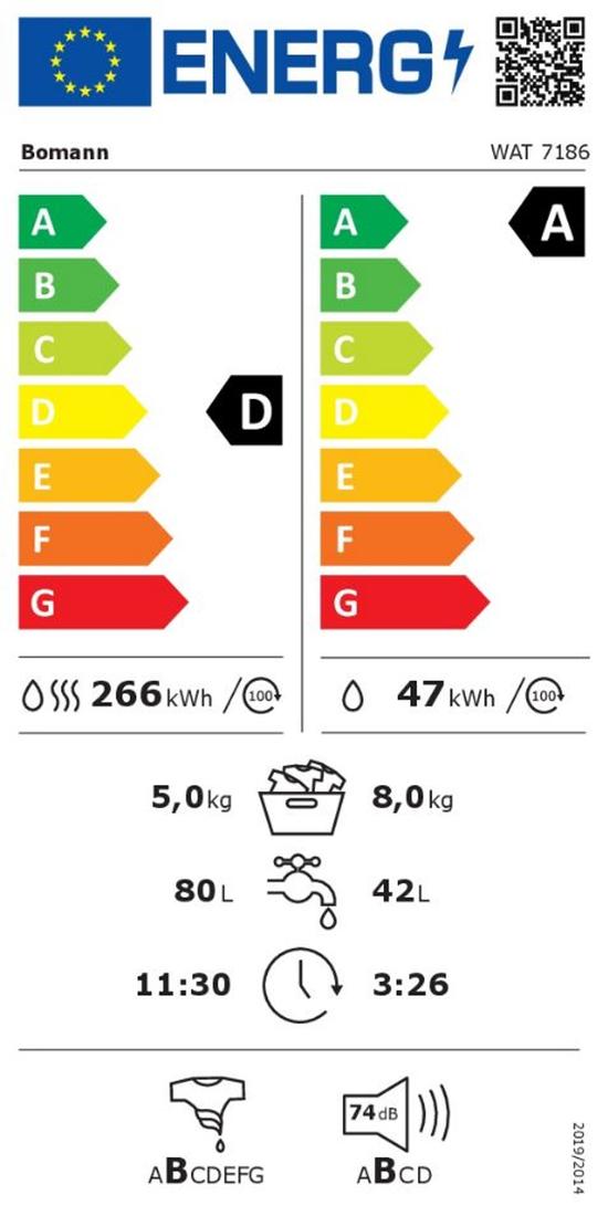 - Energialuokka: pesu A, kuivaus D