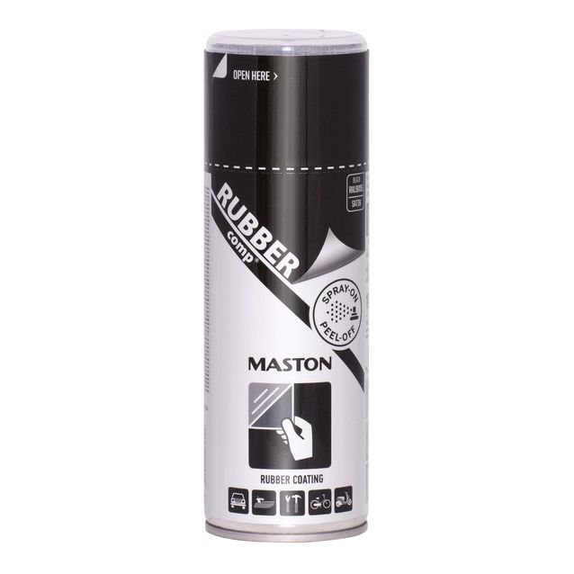 Puolikiiltävä musta Maston RUBBERcomp synteettinen kumimaalispray on helposti levitettävä, monikäyttöinen, ilmakuivava erikoiskumipinnoite. Se suojaa käsiteltävän pinnan kosteutta, happoja, kulumista ja korroosiota vastaan. RUBBERcomp pinnoite on antistaattinen, joustava ja muodostaa ei-liukkaan, pitävän kalvon. RUBBERcomp pysyy joustavana koko elinikänsä eikä halkea tai haurastu edes äärimmäisissä sääolosuhteissa. Pinnoite on testattu ja toimii lämpötiloissa -30°C - +90°C. Riittävän paksu kumimaalikerros on helppo poistaa vetämällä. Riittävä kerrospaksuus saavutetaan noin neljällä kerroksella.