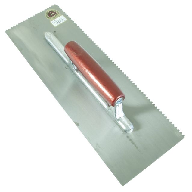 Teräksinen laastikampa puisella kädensijalla. Pitkään kädensijaan mahtuu kaksi kättä, mikä tekee levittämisestä helpompaa ja lisää voimaa. Mitä suurempi hammastuksen koko on sitä enemmän laastia voidaan levittää mikä puolestaan mahdollistaa suurempien laattojen kiinnipysymisen.
