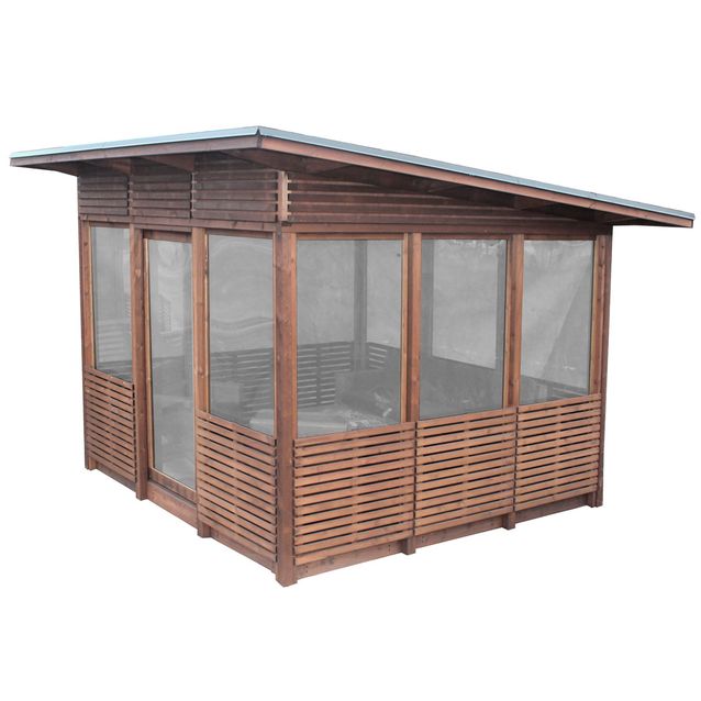 Lasipaviljongilla vietät terassikautta vaikka ympäri vuoden. Paviljonki muodostuu valmiista puu-ja lasielementeistä. Paviljongin voi sijoittaa valmiille terassille tai lisävarusteena saatavan terassilattian ansiosta mihin vain. Pakettiin sisältyy ovipaketti kiskoineen sekä katon vanerit. Katon pintamateriaalit lisävarusteena, kuten myös lattia ja koristeaidat. Paviljonkia on saatavana 3x3m.