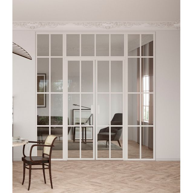 Hietakarin Bläk 729 Paris -lasiseinä pariovella ja yläikkunalla on teollisuushenkiseen tyyliin muotoiltu moderni tilanjakaja särmikkäillä ruuduilla ja valkoisilla profiileilla. Laadukkaan oven mekaanisilla osilla ja turvalasin karkaisulla on 10 vuoden takuu. Oven kehykset ja koristelistat ovat polttomaalattua alumiinia ja lasi 6 mm vahvuista karkaistua turvalasia.Lasiseinä koostuu kahdesta kiinteästä lasista, joihin on saranoitu kääntyvät ovet, sekä yläikkunasta. Ovet aukeavat ulospäin 90 astetta, ja ne varustetaan säädettävällä keskityksellä. Keskitys pyrkii palauttamaan ovet takaisin auki ja kiinni -asentoihin. Ylös asennettava peitelista estää oven aukeamisen molempiin suuntiin. Seinä asennetaan valmiisiin pintoihin mukana tulevilla kiinnityslistoilla.Mittatilaustuote: Tuote valmistetaan mittojen mukaan, joten sillä ei ole vaihto- eikä palautusoikeutta.