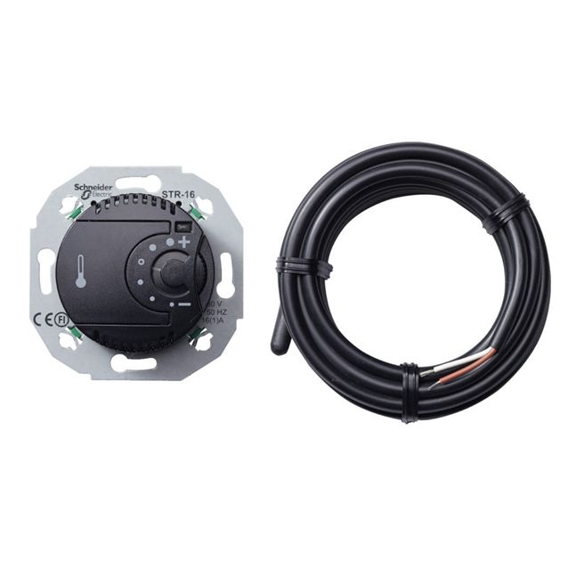 Mustassa Schneider Electric Renova LTF lattiatermostaatitssa on retrohenkinen ulkoasu nykyaikaisilla toiminnallisuuksilla.