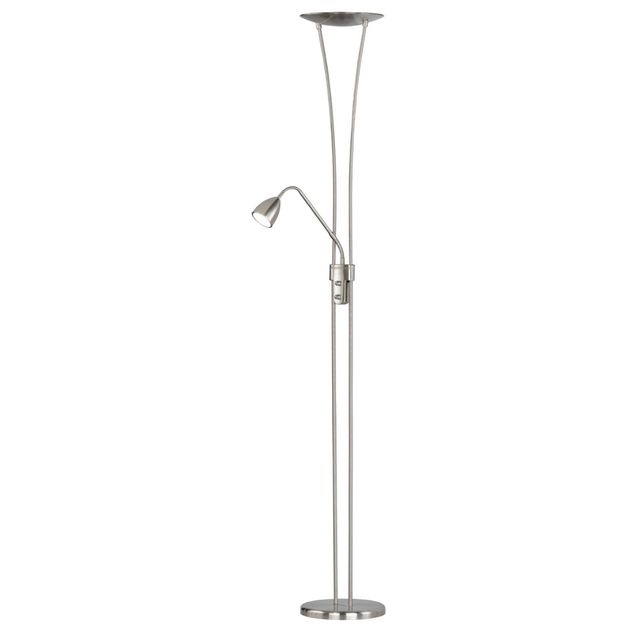 Harjatun teräksen värinen Basic Uplighter -lattiavalaisin, jossa on kätevä suunnattavalla varrella varustettu lukuvalo. Valaisimen rungossa sijaitsevilla himmentimillä voit säätää valotehoa portaattomasti - ylä- ja lukuvaloa erikseen.