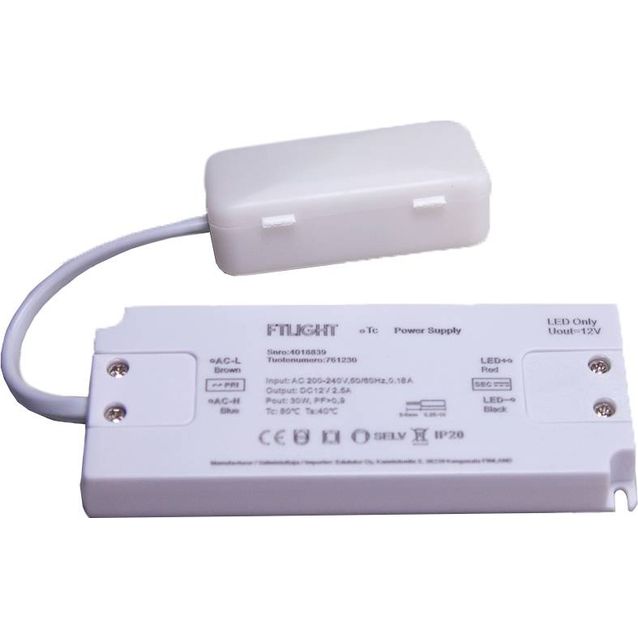 Laadukas 30W LED-muuntaja eri LED-tuotteille kuten LED-nauhoille ja -polttimoille. Mukana kytkentäboksi 3x1,5mm² jousiliittimillä. Vakiojännitepuolella ruuviliittimet. Muuntajan maksimikuormitus suositus 80%. Tätä muuntajaa käytettäessä voidaan LED-tuote himmentää erikseen ostettavalla LED himmentimellä/vastaanottimella. Muuntajassa ylijännitesuoja sekä oikosulkusuoja. Käyttöjännite: 230V ja ulostulo: 12V.