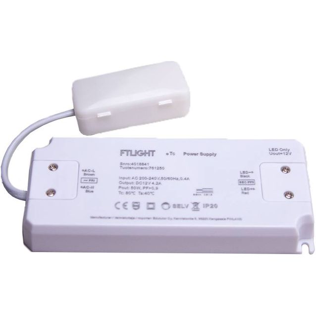 Laadukas 50W LED-muuntaja eri LED-tuotteille kuten LED-nauhoille ja -polttimoille. Mukana kytkentäboksi 3x1,5mm² jousiliittimillä. Vakiojännitepuolella ruuviliittimet. Muuntajan maksimikuormitus suositus 80%. Tätä muuntajaa käytettäessä voidaan LED-tuote himmentää erikseen ostettavalla LED himmentimellä/vastaanottimella. Muuntajassa ylijännitesuoja sekä oikosulkusuoja. Käyttöjännite: 230V ja ulostulo: 12V.