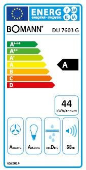 Bomann DU7603G on tyylikäs musta liesituuletin Ambient lighting-taustavalotoiminnolla. Moderni ja minimalistinen liesituuletin on varustettu mustalla lasipaneelilla ja hipaisukytkimillä. Laitteen taustavaloksi voit valita joko tummansinisen, punaisen, vihreän tai vaaleansinisen. Alumiininen rasvasuodatin on konepestävä.