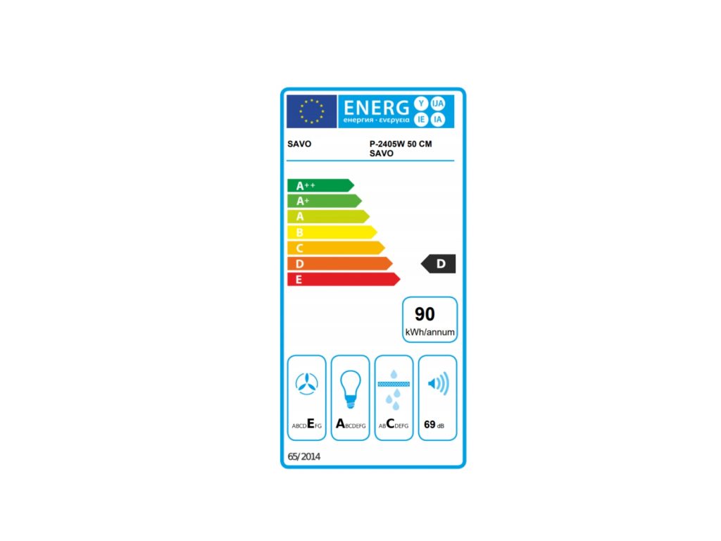 Savon valkoinen P-2405-W-liesituuletin, jonka leveys on 50 cm. Kalusteeseen integroitavassa tuulettimessa on ulosvedettävä lasilippa, mekaaniset käyttökytkimet ja tehokas LED-valaistus. Tämä tuuletin sopii heille, jotka haluavat perinteisen liesituulettimen kevyellä ilmeellä.