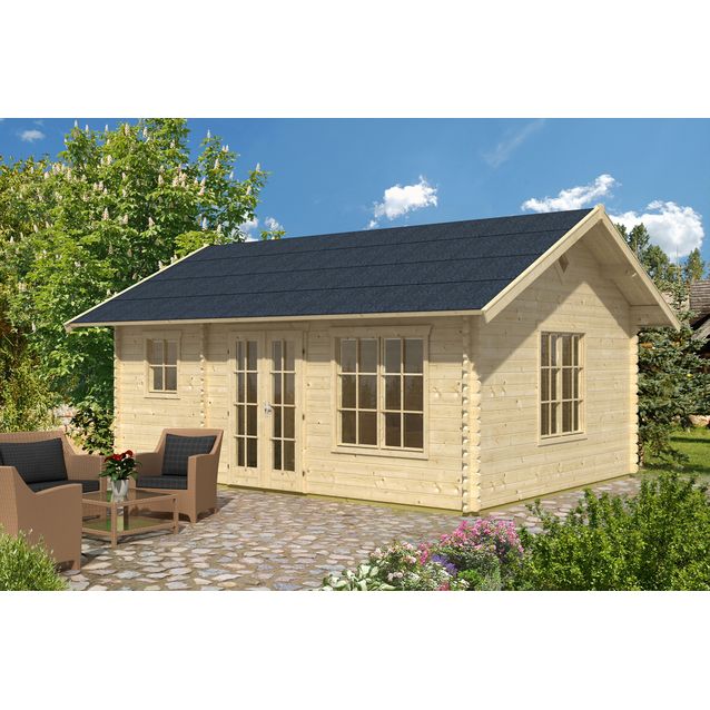 Korkealaatuinen Skan Holz Esbjerg 2 kesämökki tarjoaa reilun 23 neliötä tilavaa ja mukavaa tilaa rentoutua ja nauttia luonnonläheisyydestä. Mökkiin sisältyy 1,7 x 4,2 metrin kokoinen erillinen varastotila, jonka yläpuolella on makuulavitsa. Tämän harjakattoisen mökin seinät ovat 45 mm paksuja ja toimitukseen sisältyy 19 mm paksu lattia.