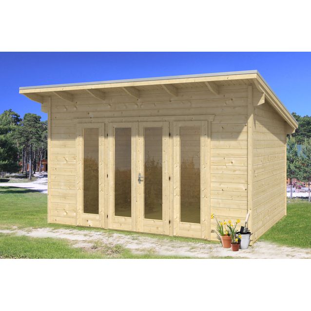 - Toimitussisältö: Täydellinen puuosatoimitus, ovi, ikkunat ja kattohuopa Icopal R330 ruskeanharmaa (vedenpitävä alushuopa). Kuviollinen ja värillinen pintahuopa ostettava tarvittaessa erikseen.