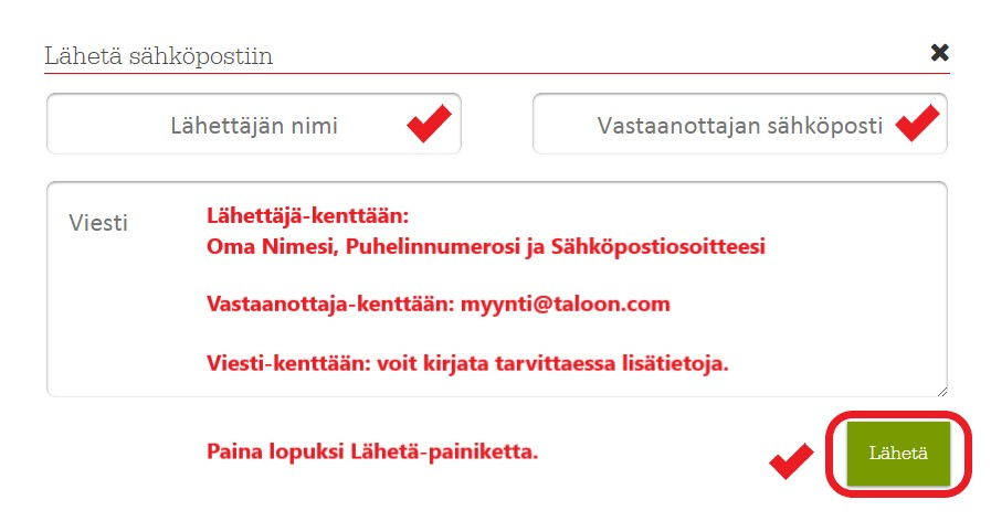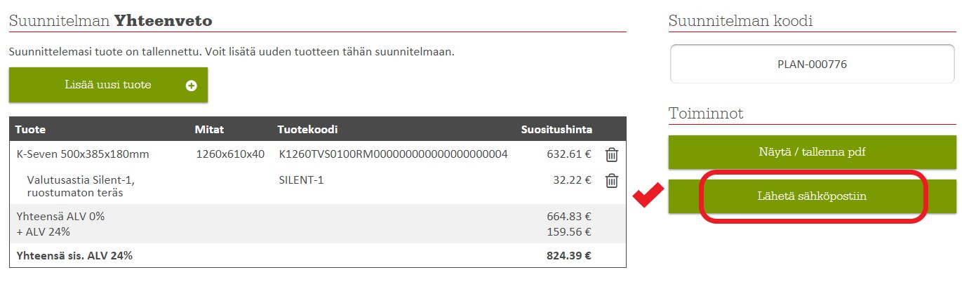 Altaan suunnittelu ja tilaaminen on todella vaivatonta ja voitkin valita jommankumman seuraavista vaihtoehdoista:1. Klikkaa alla olevasta linkistä Stala*Designeriin ja suunnittele itse oma keittiötaso-tiskiallasyhdistelmäsi. Suunnitteluohjelma laskee sinulle oikean hinnan sitä mukaa, kun lisäät, muutat tai poistat tietoja ja lisävarusteita. Kun suunnitelmasi on valmis, voit toki tulostaa ja tallettaa sen itsellesi PDF-dokumenttina ja/tai lähettää linkin suunnitelmaan omaan sähköpostiisi. Tärkeintä on, että lähetät suunnitelmasi meille sähköpostilla käyttäen Stala*Designerin Valmis-lehdykällä olevaa Lähetä-painiketta. Täytä ensin Lähettäjä-kenttään Oma Nimesi, Puhelinnumerosi ja Sähköpostiosoitteesi (esim. Maija Meikäläinen, 050-7780964, maija.meikalainen@gmail.com). Yhteystietojen täyttäminen on ERITTÄIN TÄRKEÄÄ, jotta myyjämme voi ottaa sinuun yhteyttä! Vastaanottaja-kenttään täytetään myyntipalvelumme sähköpostiosoite myynti@taloon.com. Kun saamme sähköpostisi, myyjämme ottaa sinuun yhteyttä saman tai seuraavan arkipäivän aikana.