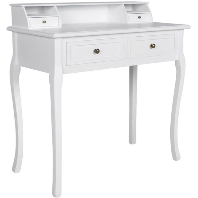 Tämä kaunis meikkipöytä tulee piristämään makuuhuonettasi tai pukuhuonettasi! Meikkipöydässä on kaksi vetolaatikkoa pöytälevyn päällä, joihin voit laittaa arvoesineesi. Lisäksi, pöydän alla on vielä kaksi täysimittaista ylimääräistä vetolaatikkoa säilytystä varten. Vetolaatikot voidaan poistaa helposti puhdistusta varten. Pehmeän valkoinen pinta ja upeat muodot saavat sen vaikuttamaan todella arvokkaalta ja tyylikkäältä. Tämä lista sisältää yhden meikkipöydän. Valikoimassamme on monia meikkipöydän kanssa yhteensopivia tuotteita kuten jakkara, peili ja paljon muuta! Ota huomioon, että tämä huonekalu on käsintehty, valmistettu puusta ja maalattu valkoiseksi, joten pienet virheet voivat olla mahdollisia.