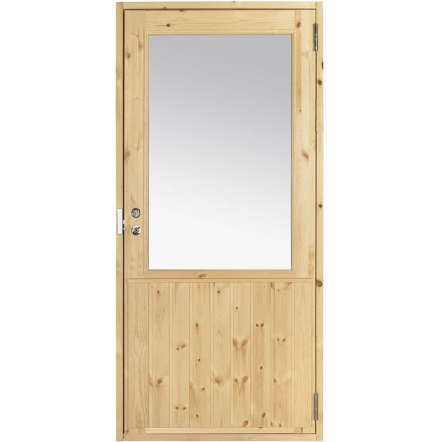 Kaskipuun ML4A perinteinen mökkiovi varustettuna lasiaukolla. Molemminpuolinen pystypanelointi 95 mm:n terveoksaisella mäntypaneelilla.