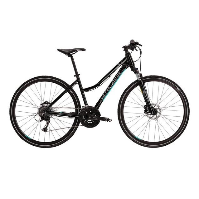 Kross Evado 5.0 -hybridipyörä, naisten malli. Sopii maasto- ja tieajoon. Alumiinirunkoisessa pyörässä on 27 vaihdetta. Väri musta/turkoosi.