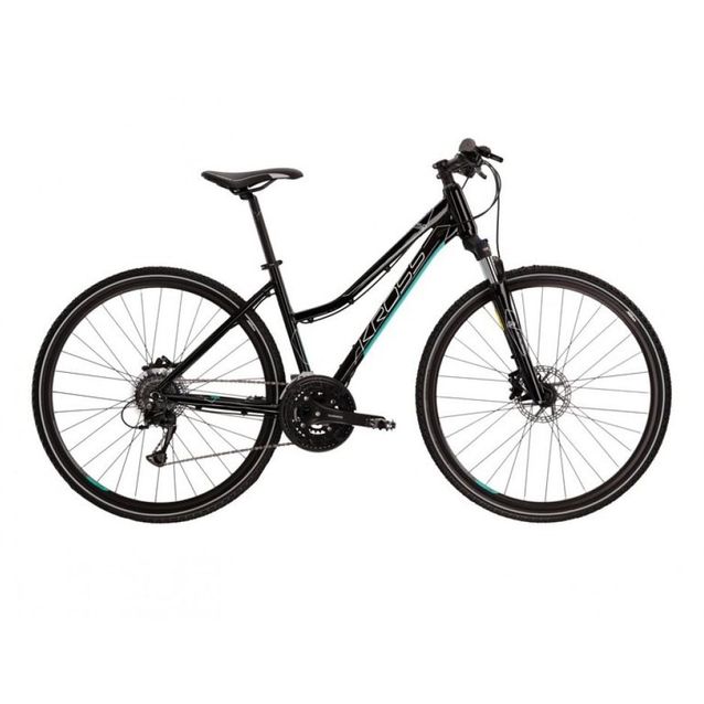 Naisten Kross Evado 5.0 -maastopyörä, väri musta/turkoosi. Alumiinirunkoisessa pyörässä on 27 vaihdetta.