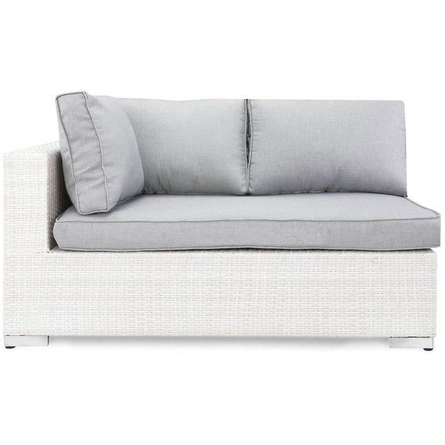 Valkoinen Bahamas-kulmamoduuli on tyylikäs ja mukava istuin, jota voit yhdistellä mielesi mukaan muihin saman sarjan moduuleihin. Polyrottinki on säänkestävä ja huoltovapaa materiaali ja toimitukseen sisältyy myös säänkestävät pehmusteet. Kyseessä on oikean kulman moduuli istuimelta katsottuna.