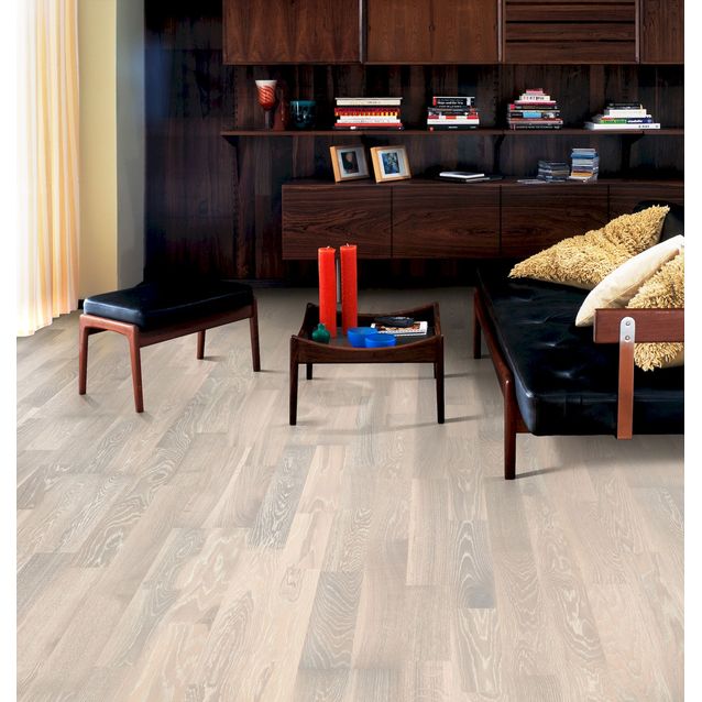Kährsin ihastuttava vaalea 2-sauvainen Tammi Creme -parketti tuo sisustukseen valoa ja avaruutta. Vaalean sävyn alta kuultaa puunsyykuvio, jota on korostettu harjauskäsittelyllä. Tammen luonnollista värivaihtelua ja oksia. Laudan kaksi vierekkäistä noin 100 mm leveää tammisauvaa antavat lattialle elegantin ilmeen. Mattalakattu pinta on miellyttävä ja helppohoitoinen. Laudan mitat 15x200x2423 mm. Pakkaus 2,91 m² (6 lautaa). Parketti sopii asennettavaksi lattialämmityksen kanssa.