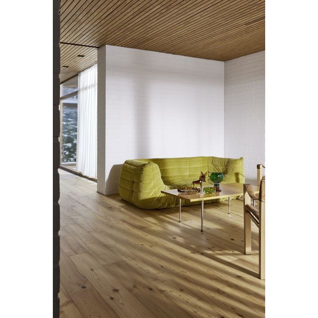 Timberwisen Country Collection -malliston vaalea lehtikuusiparketti. Eläväpintaisessa ja lämminhenkisessä lankkuparketissa on näyttävät oksakuviot. Tuote on öljyvahattu ja harjattu. Lankku on mitoiltaan 14,5x185x2180 mm, ja siinä on mikroviisteet neljällä sivulla.