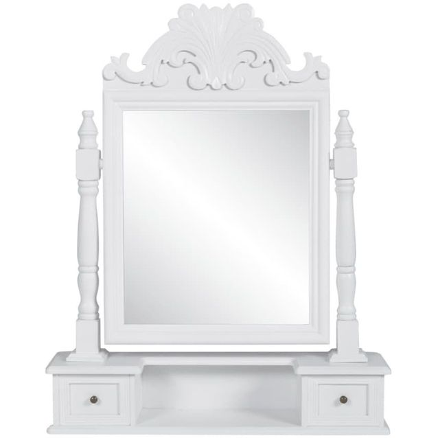 Tyylikäs peili on asetettu laatikostopöydän keskelle. Peiliä voidaan säätää eri kulmiin tarpeesi mukaan. Alustapöydässä on kaksi pientä vetolaatikkoa, jossa voit säilyttää arvotavaroitasi.