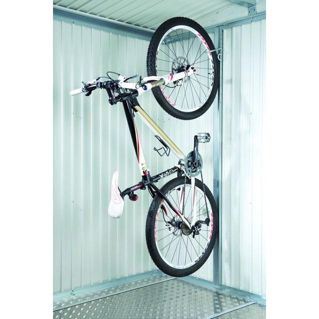 BikeMax polkupyöräteline Biohort Europa puutarhavajaan. BikeMaxin avulla varastoit polkupyöräsi kätevästi ja tilaa säästävästi. Polkupyöräteline sopii pyörille, joiden rengaskoko on maksimissaan 26”. Polkupyöräkoukku on säädettävissä kuuteen eri asentoon. BikeMax voidaan kiinnittää mihin tahansa seinään, esimerkiksi autotallin seinään.