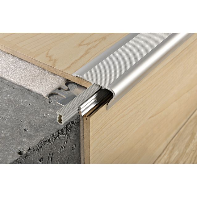Anodisoidun hopean värinen porraskulmalista Progress Profiles Style Stair L on tyylikäs porraskulmalista materiaaleille, joissa pitää ottaa huomioon lattiamateriaalien luontainen eläminen. Tällaisia materiaaleja ovat esimerkiksi parketit ja laminaatit, joihin alumiinista valmistettu lista tuo viimeistellyn loppusilauksen. Toimitus sisältää pohjakiskon sekä PIN 07 -insertin, lista soveltuu 7 -9 mm lattiamateriaaleille.