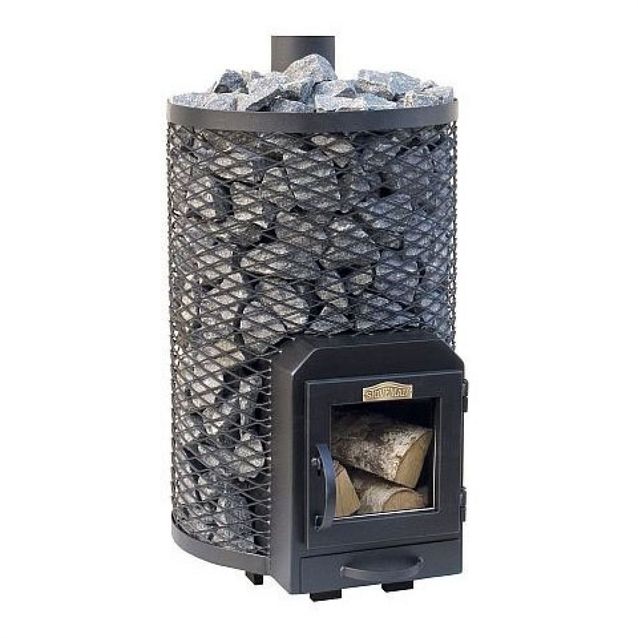 Näyttävä puukiuas, joka pitää sisällään muhkean määrän kiviä, joka takaa kosteat ja happirikkaat löylyt kovassakin saunan lämmössä.