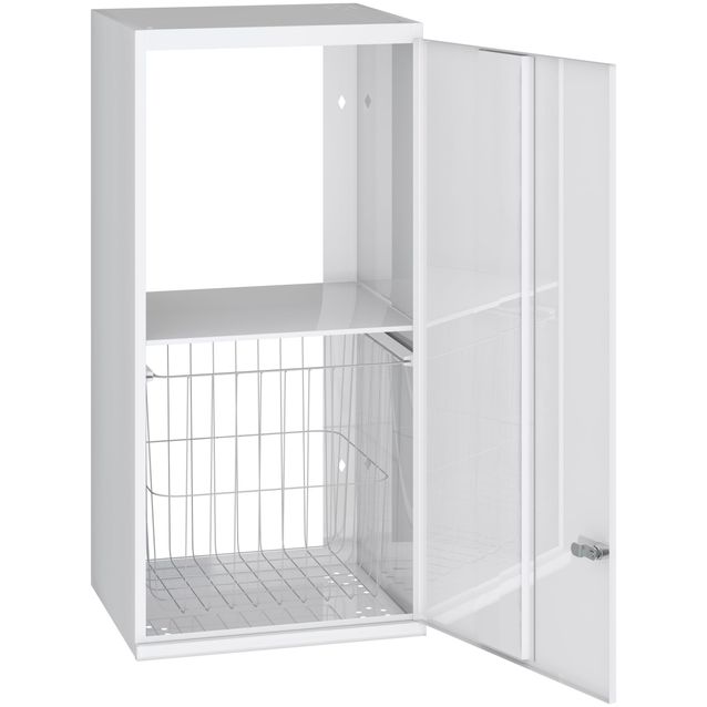 Polarian 300 mm leveä PYK 300 -pyykkikaappi. Yläkaappi on varustettu yhdellä ulosvedettävällä korilla. Isot tuuletusaukot pohjassa ja päällä hoitavat kaappiin riittävän tuuletuksen.