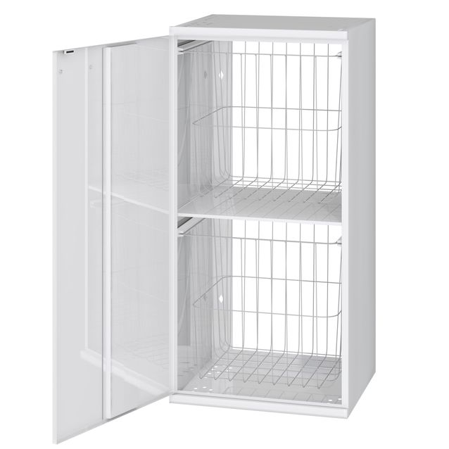 Polarian 300 mm leveä PYK 300 -pyykkikaappi. Alakaappi on varustettu kahdella ulosvedettävällä korilla. Isot tuuletusaukot pohjassa ja päällä hoitavat kaappiin riittävän tuuletuksen.