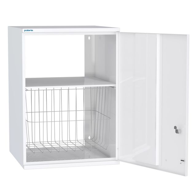 Polarian 400 mm leveä PYK 400/700 -pyykkikaappi. Kaapissa on yksi kori ja hylly pesuaineita varten. Yläkaappi on lukittava, jolloin pesuaineet eivät ole lasten ulottuvilla.