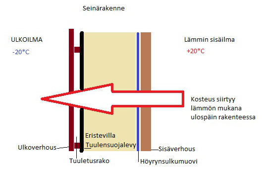 Oikein suunniteltu rakenne mahdollistaa kosteuden kuivumisen ulospäin. Tämä saavutetaan, kun höyrynvastus vähenee rakenteessa ulospäin mentäessä.
