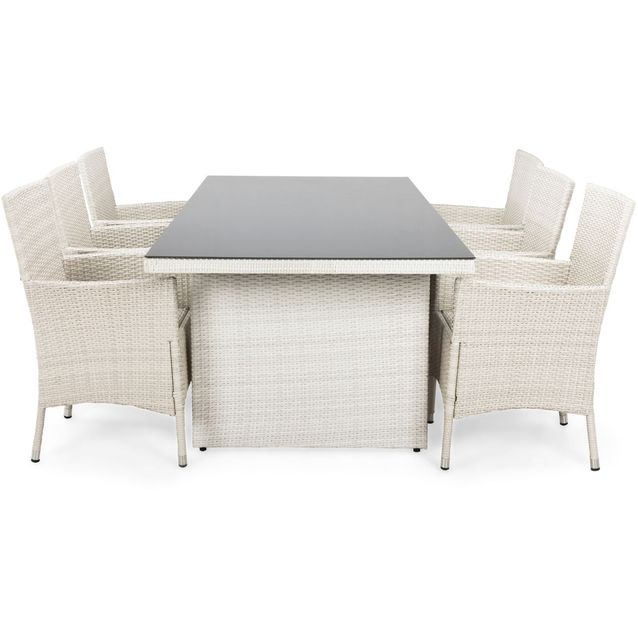 Valkoinen kuuden tuolin Majestic-ruokailuryhmä on säänkestävää ja laadukasta polyrottinkia. Tämän ryhmän ääressä viihtyy niin aterioiden kuin vain rentoutuenkin. Tukevan pöydän lasikansi on harmaa.