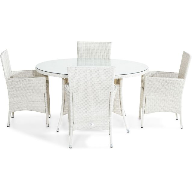 Valkoinen Thor-ruokailuryhmä sisältää halkaisijaltaan 140 cm pöydän ja neljä nojatuolia. Polyrottinki ja pöydän lasikansi ovat huoltovapaita, joten ulkonäön ja laadun lisäksi ruokailuryhmän etuna on helppohoitoisuus. Pehmusteet eivät sisälly toimitukseen.