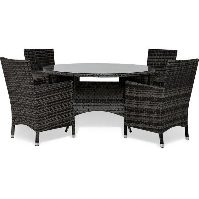 Thor-ruokailuryhmä sisältää halkaisijaltaan 140 cm pöydän ja neljä nojatuolia. Polyrottinki ja pöydän lasikansi ovat huoltovapaita, joten ulkonäön ja laadun lisäksi ruokailuryhmän etuna on helppohoitoisuus. Pehmusteet eivät sisälly toimitukseen.