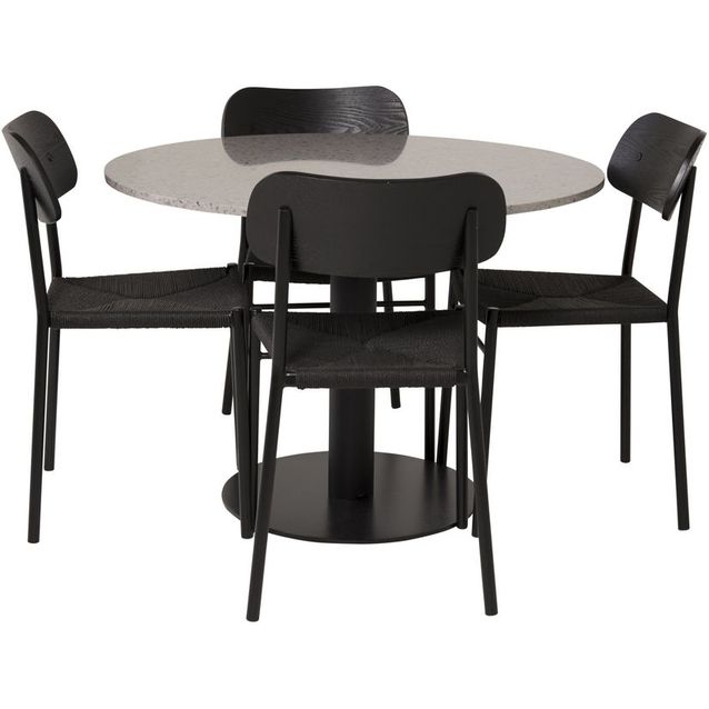 Razzia on moderni pyöreä ruokapöytä, jossa on kaunis terazzo-pinta ja mustasta metallista valmistettu runko. Vankka muotoilu yhdistyy siroihin muotoihin. Pöydän mukana toimitetaan neljä tyylikästä tuolia, jotka kruunaavat kokonaisuuden täydellisesti.